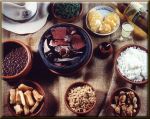 משעועית שחורה, בשר חזיר ועלי קסאבה טחונים. ההפיג'ואדה נפוצה מאוד בברזיל, בפורטוגל ובמדינות אחרות כמו אנגולה שהיו בעבר מושבות פורטוגזיות. מקור השם פיג'ואדה מגיע מהמילה הפורטוגזית 'פיג'או' (oãjief) שמשמעותה 'שעועית'. קיימים חילוקי דעות בקשר למקור הפיג'ואדה אולם כיום הדעה הרווחת היא שהיא החלה את דרכה כמזון עבור העבדים האפריקנים שהובאו לברזיל, בשל המחיר הזול של מרכיביה (מרכיבים כגון שעועית, אורז, קסאבה ושאריות בשר חזיר), ועם הזמן היא התפשטה בן המעמדות הנמוכים, עד שלבסוף הפכה למאכל לאומי, אותו ניתן להשיג גם במסעדות המשובחות ביותר. דעות אחרות כוללות את ההשערה שמקורה של הפיג'ואדה הוא למעשה בקסולה הצרפתית או במנות השעועית והחזיר שהיו נפוצות בעבר במרכז פורטוגל. בשעה שהפיג'ואדה הקלאסית הוכנה עם החלקים הכי פחות איכותיים בחזיר (האוזניים, הזנב והרגלים) כיום נעשה שימוש בבשר מכל החיה, ובכל מצב. מתכונים שונים קוראים לשימוש בשילובים שונים של ביקון, נקניקים, בשר משומר, בשר ממולח ואף בשר מעושן. את תבשיל הפיג'ואדה, מומלץ לבשל מעל אש חלשה, בסיר חמר עבה. הפיג'ואדה בצורתה הסופית, מורכבת מחתיכות שונות של בשר ושעועית שחורה ומעליהן מרק בשר חום-סגול המקנה לתבשיל את יחודו. טעם הפיג'ואדה ידוע כחזק ומלוח מעט אולם הוא איננו נחשב חריף. בברזיל, הפיג'ואדה מוגשת בדרך כלל בתוספת מנות צדדיות. מנות אלו יכולות להשתנות בהתחשב באווירה, והן כוללות: אורז, חזיר בשום, כרוב עלים, קמח מעלי קסאבה צלויים, עלי קסאבה מטוגנים עמוק, בננות מטוגנות עמוק ותפוזים. בנוסף, נהוג להגיש את המנה בתוספת שמן מפלפל חריף, וכמשקה, כוס קפיריניה. נדרשות מספר שעות כדי להכין מנה של פיג'ואדה ולכן, נהוג לאכול אותה רק לעתים רחוקות, ורק בצהרים. מסעדות בדרך כלל יגישו פיג'ואדה רק פעם או פעמים בשבוע (בדרך כלל בימי רביעי ראשון או שבת), אולם קיימות גם כאלו שיגישו את המנה לאורך כל השבוע. | |||